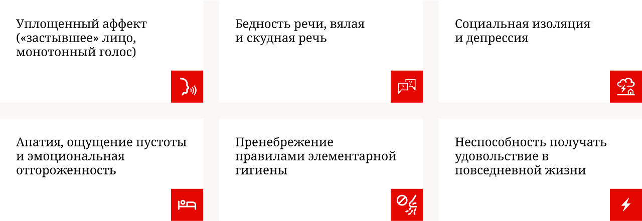 У людей с шизофренией часто отсутствует целеустремленность, эмпатия, энтузиазм, социальная отзывчивость. Этими психологическими способностями обладает большинство людей, но при первых проявлениях шизофрении они «утрачиваются»7.