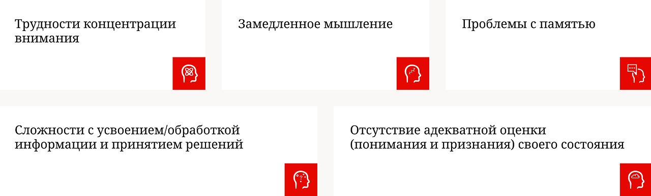 К ним относятся нарушения внимания, памяти и интеллекта. Такие симптомы возникают еще до проявления непосредственных признаков шизофрении. Обычно они незаметны, врач может обнаружить их во время специальных тестов8.