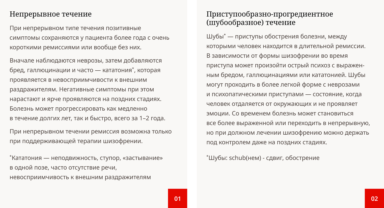 Среди типов течения российские психиатры выделяют два типа течения шизофрении: непрерывное и приступообразно-прогредиентное (шубообразное)9.