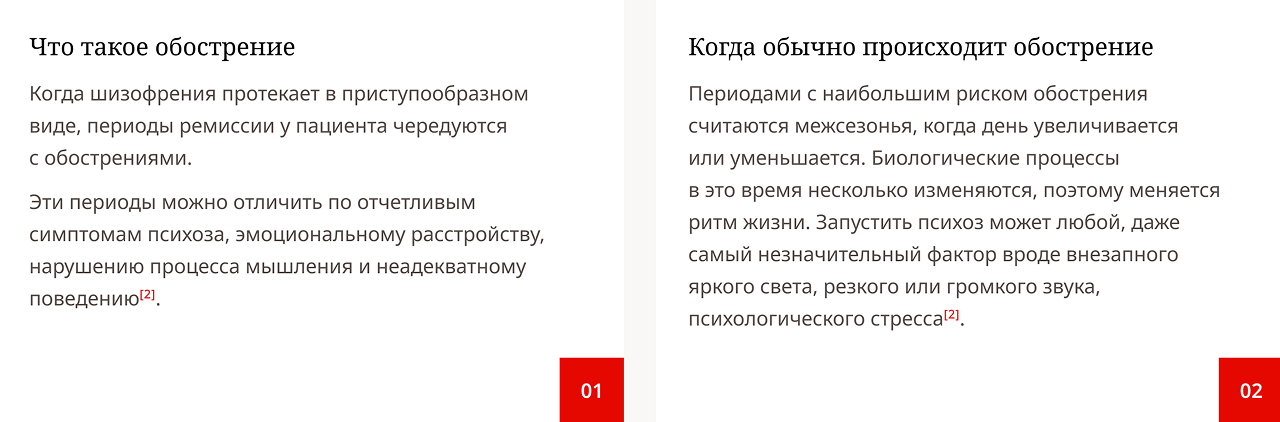 Острая стадия может перейти в стадию полной ремиссии — это, кстати, явление довольно частое, наблюдается как минимум у трети пациентов4. Или в рекуррентную шизофрению, когда на фоне ремиссии периодически случаются обострения. Нередко приступы легко прогнозируются и появляются, например, весной или осенью.