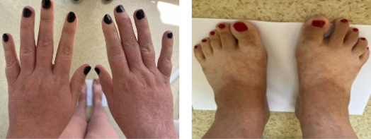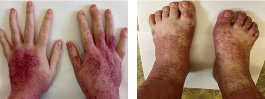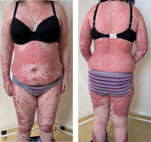 В 37 лет на фоне проводимой терапии отмечала обострение кожного патологического процесса и возобновление суставного синдрома (припухлость, артрит дист. м/ф сустава 3-его пальца правой кисти, дактилиты всех пальцев правой стопы, припухлость правого л/запястного сустава). Пациентка одна воспитывает двоих детей 9 и 5 лет. Из-за выраженных, сложно скрываемых от окружающих проявлений псориаза и псориатического артрита пациентка испытывала сильное чувство стеснения и стыда. А проявления суставного синдрома мешали в повседневной бытовой деятельности и в уходе за детьми, делали невозможными активные занятия с ними.