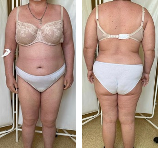 На фоне терапии на 16-й неделе зафиксирован клинически значимый ответ на лечение: достигнут PASI −100. Также пациентка осмотрена ревматологом, установлен: псориатический спондилоартрит, низкой степени активности, с поражением суставов кистей, стоп, лучезапястных, плечевых, тазобедренных, коленных суставов, илеосакральных сочленений (двусторонний сакроилеит рентген II стадии по Dale). Дактилиты I-V пальцев правой стопы (в анамнезе). ФК I-II.