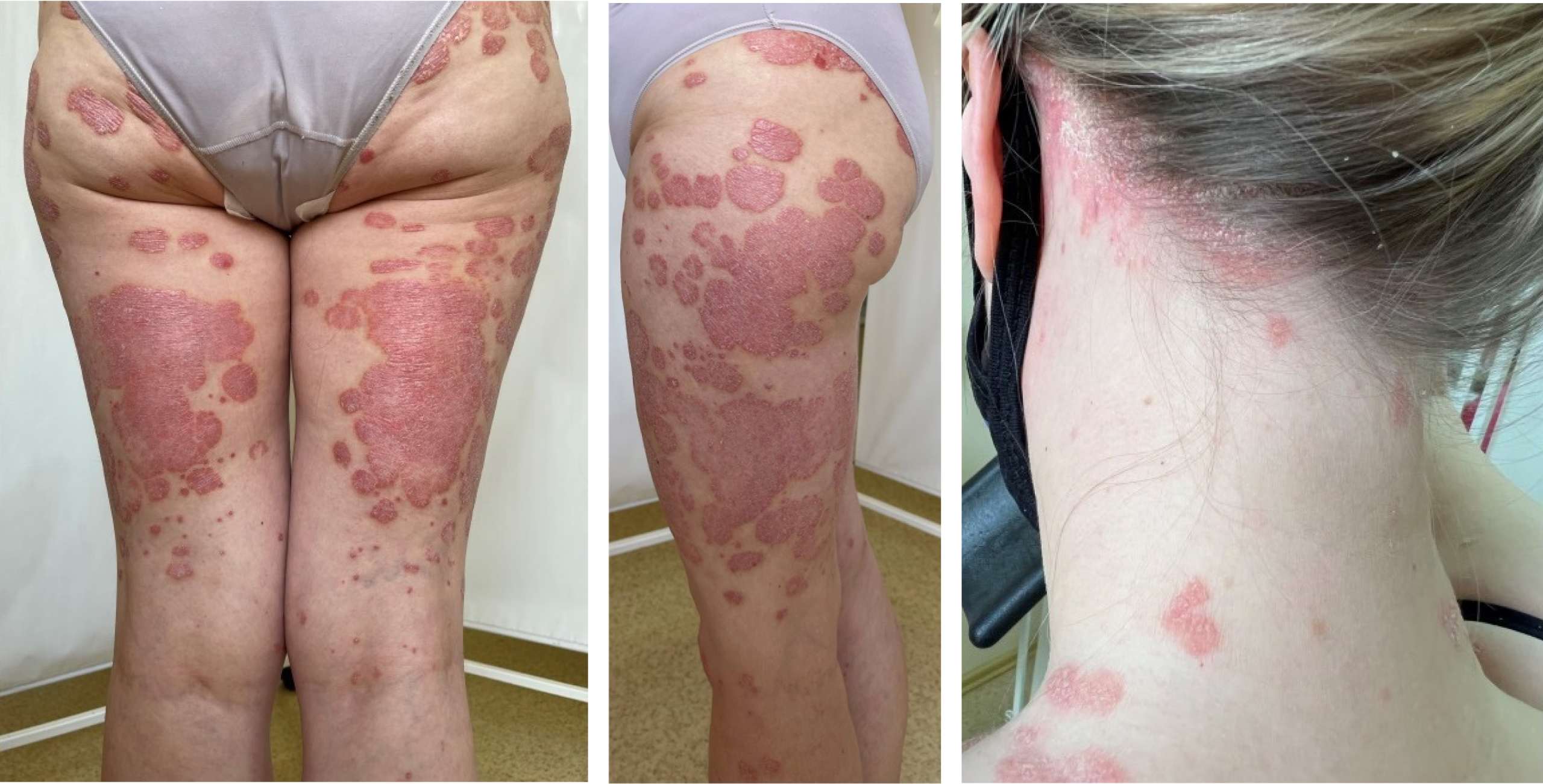 В дальнейшем, с учетом выраженности клинических проявлений и торпидностью к ранее проводимой терапии пациентка переведена на терапию препаратом Гуселькумаб в дозе 100 мг согласно инструкции по применению препарата в виде подкожных инъекций. Через 12 недель терапии отмечен полный регресс высыпаний, отсутствие новых элементов: достигнут PASI −100. Пациентка вернулась к нормальному образу жизни с повышением качества своей трудовой деятельности.