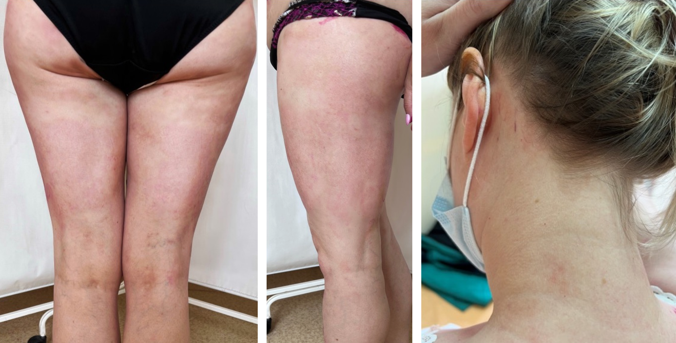 Пациентка работает администратором гостиничного комплекса; распространенный характер высыпаний, сопровождающийся интенсивным зудом отрицательно влияли на качество работы с клиентами и отразились на эмоциональном фоне в развитием депрессии; жизнь больной складывалась из длительных больничных отпусков и визитов к психологу, что не приносило нужного результата.