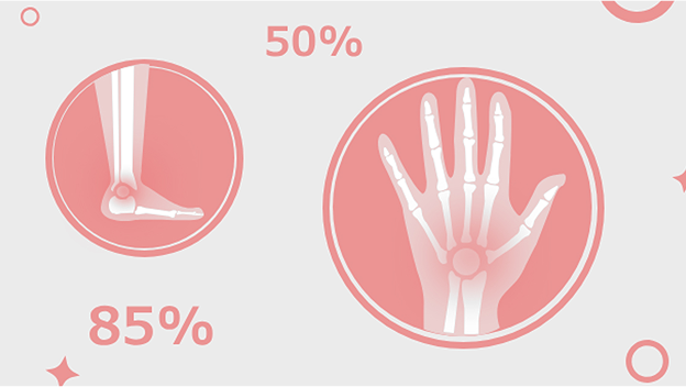 Это один из наиболее инвалидизирующих вариантов, так как воспаление затрагивает большое число суставов с сопутствующим нарушением их функций2. Ощущение скованности по утрам или после состояния покоя может продолжаться часами или даже весь день. Дети часто жалуются на слабость и утомляемость. Нередко температура тела повышается до 38°С.