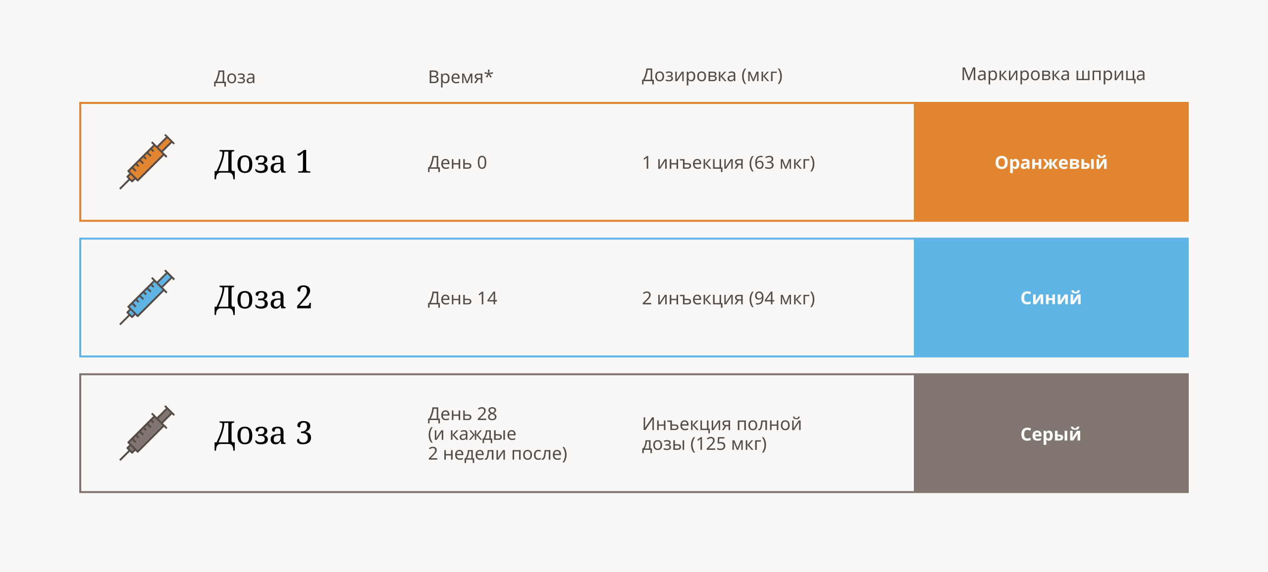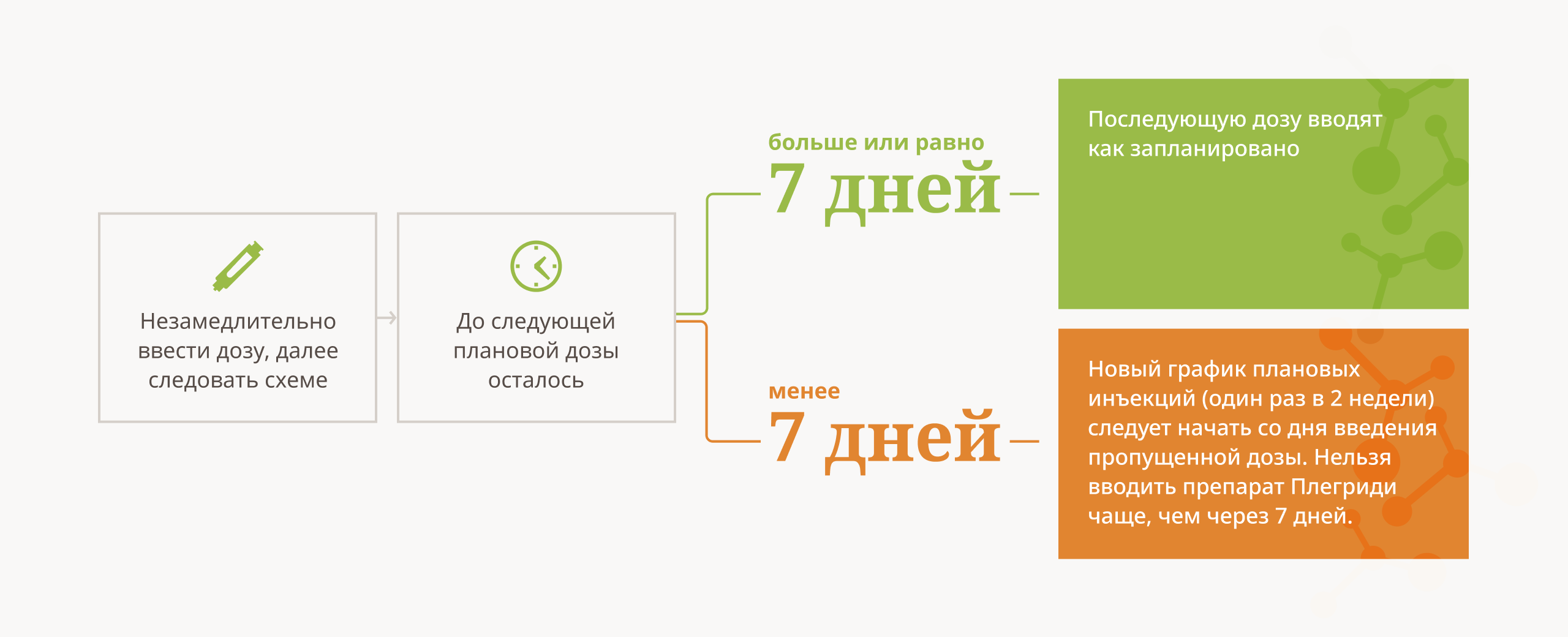 Постепенное увеличение дозы Плегриди в начале лечения способствует лучшей переносимости гриппоподобных симптомов, сопровождающих начало применения интерферонов.
