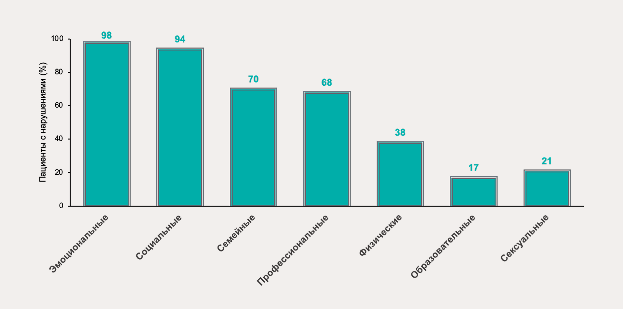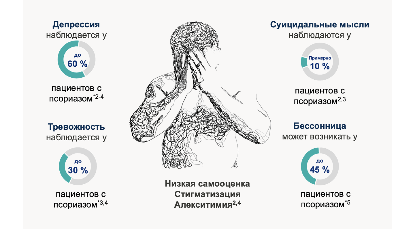 Псориаз оказывает негативное влияние на качество жизни пациентов, превосходящее многие другие хронические заболевания[1]. Пациенты с псориазом испытывают социальную стигматизацию и неприятие обществом. Псориаз имеет видимые проявления, что очень тяжело психологически[2].