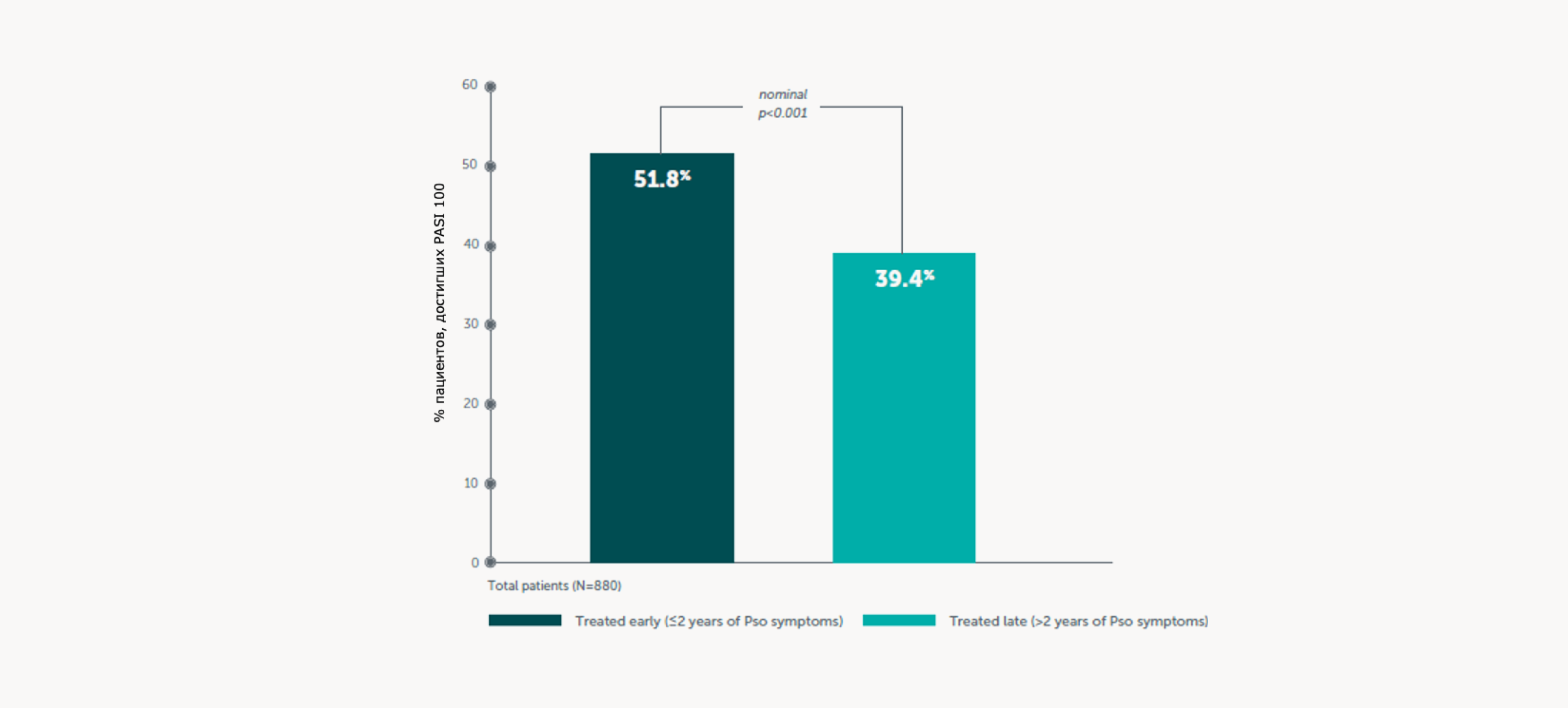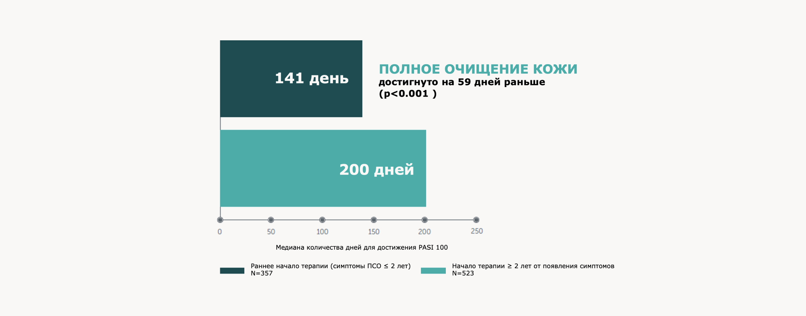 При раннем начале терапии препаратом ТРЕМФЕЯ пациенты достигали полного очищения кожи (PASI 100), в среднем, на 59 дней быстрее по сравнению с пациентами, которые начали лечение позже.