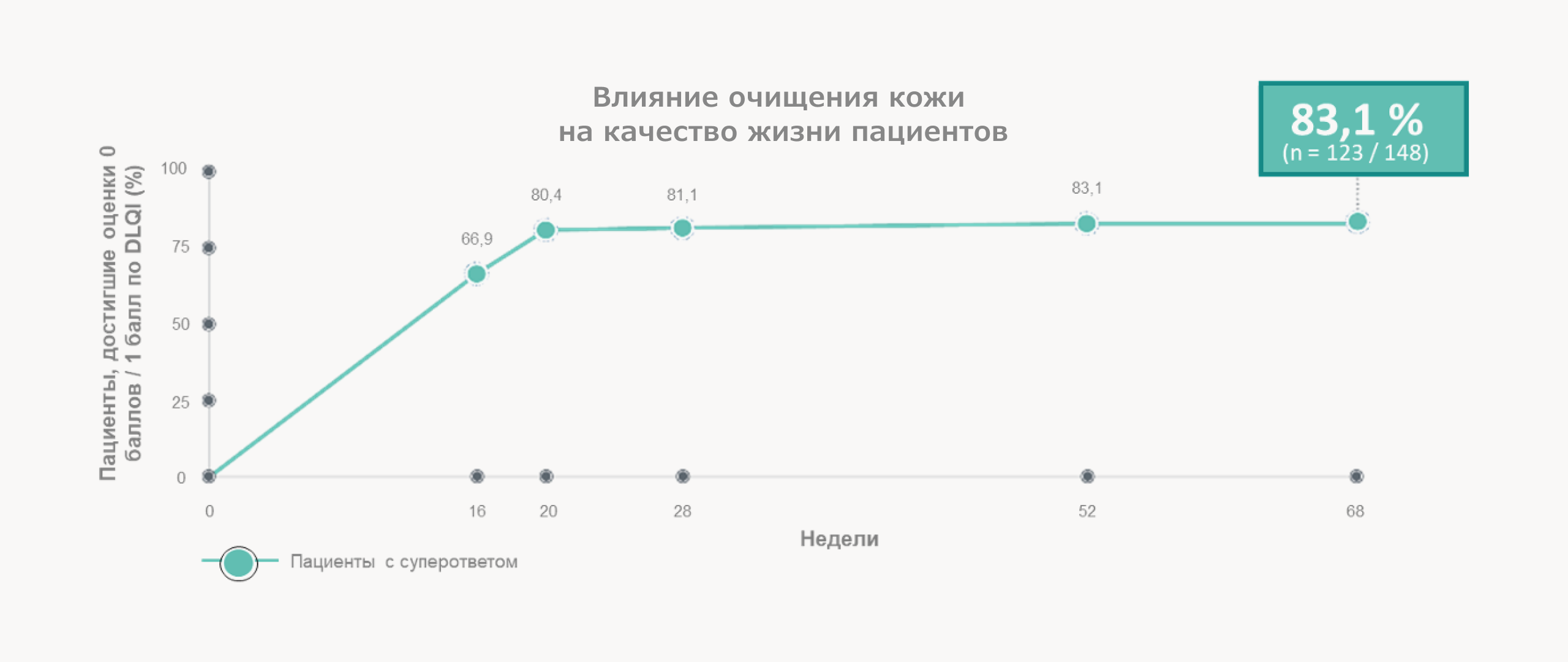 Значительное очищение кожи у пациентов с суперответом* сопровождается самым высоким уровнем качества жизни, сохраняющимся длительное время[13][14][15] (более 80% суперответчиков достигли оценки 0 баллов / 1 балл по индексу DLQI на неделе 68).