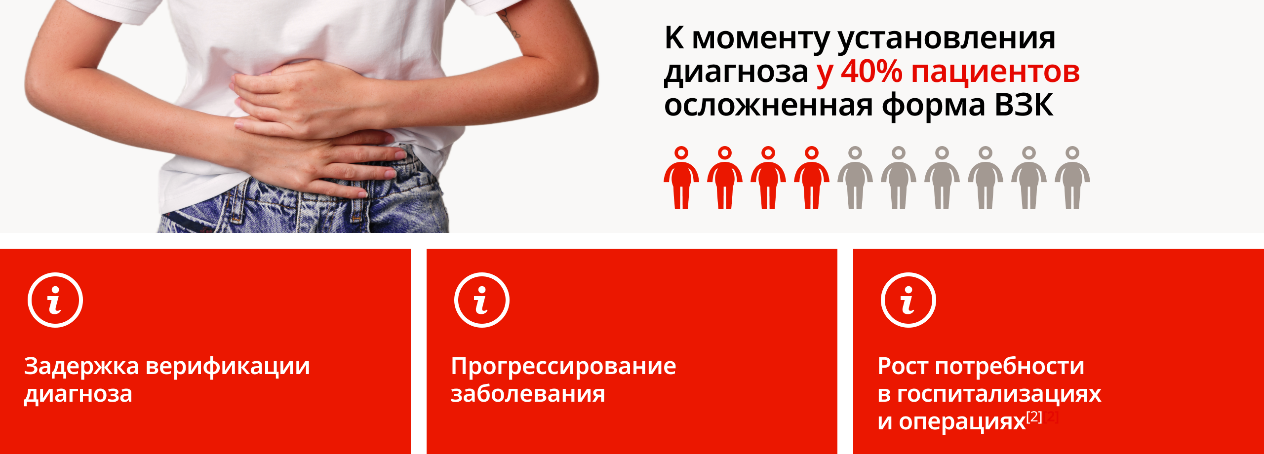 Согласно данным исследования ESCApe диагноз ЯК устанавливается в среднем через 1,4 года (16,8 мес), для БК этот период значительно больше – 3,7 лет (44,5 мес). Задержка с диагностикой и с началом лечения ухудшает прогнозы и исходы ВЗК, приводя к развитию инвалидизирующих осложнений. К моменту установления диагноза у 40% пациентов наблюдается осложненная форма заболевания.[1]