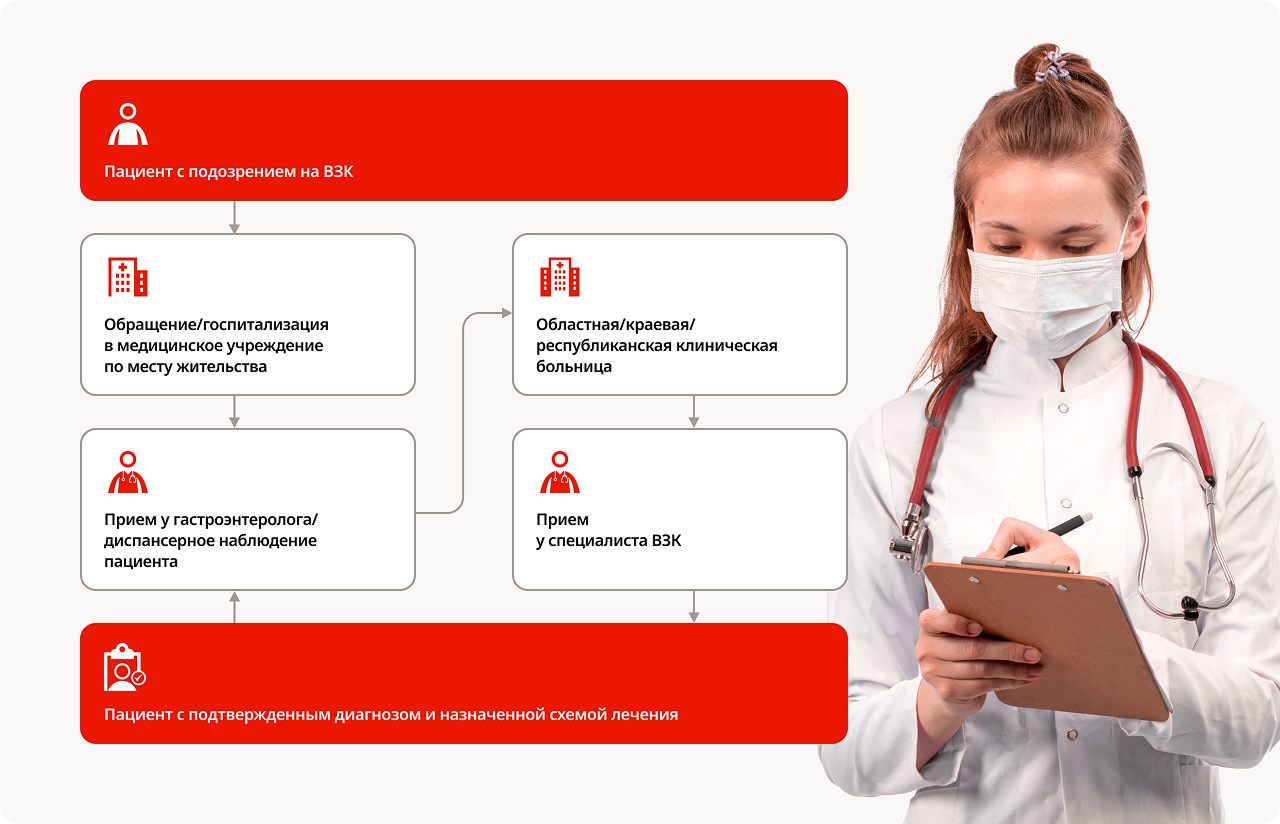 При подозрении на ВЗК пациент должен получить у гастроэнтеролога по месту жительства направление в ОКБ (гастроэнтерологическое отделение / колопроктологическое отделение / Центр ВЗК) для подтверждения диагноза и назначения терапии.