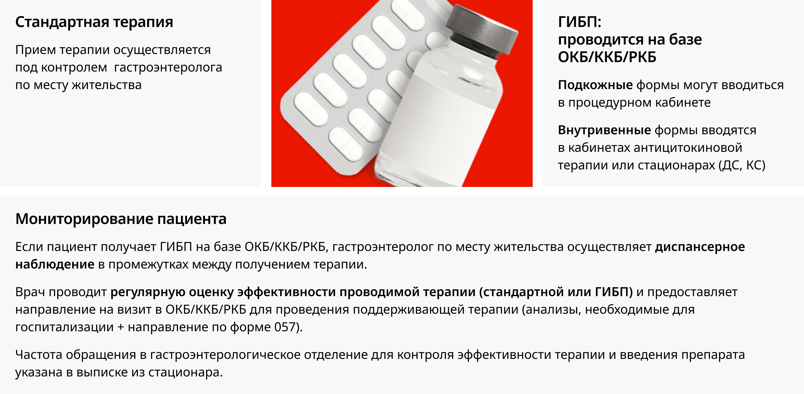 Если пациенту рекомендована стандартная терапия, он может проходить лечение по месту жительства под наблюдением гастроэнтеролога поликлиники. Если принято решение о назначении ГИБП, то пациент получает лечение на базе ОКБ (или при децентрализованном типе организации мед. помощи в регионе — на базе многопрофильных стационаров, работающих по КСГ ГИБП для больных гастропрофиля).