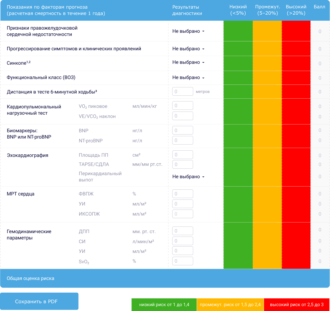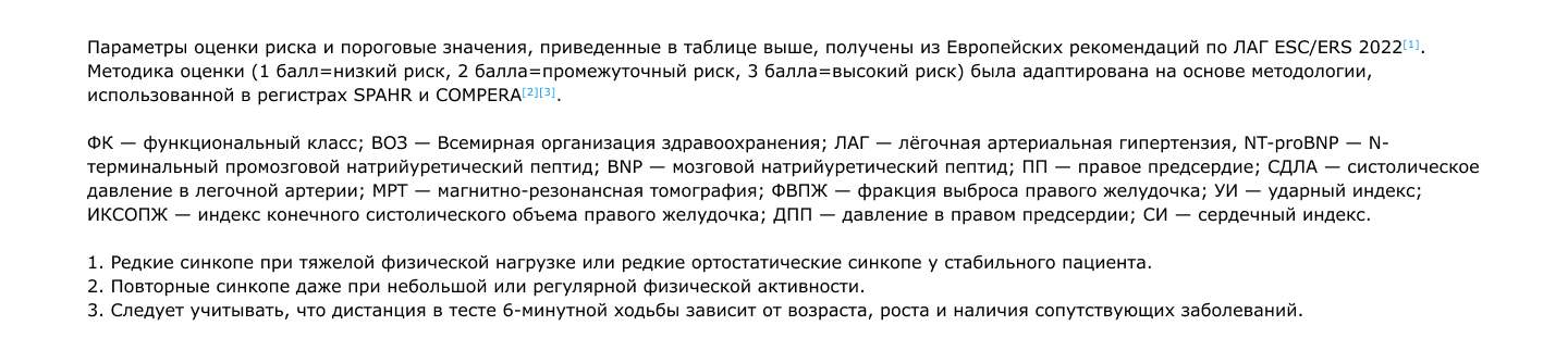 В инструменте представлены факторы, указывающие на статус низкого, промежуточного или высокого риска у больных с ЛАГ, что соответствует годичной летальности <5%; 5–20% и >20% соответственно. Важно отметить, что у конкретного больного показатели клинико-функционального, гемодинамического статуса, лабораторных тестов, данных ЭхоКГ/МРТ и другие могут относиться к разным категориям риска.