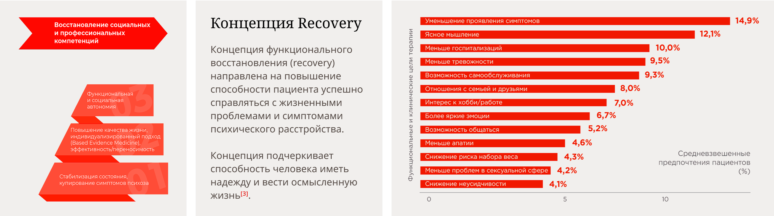 Адаптировано из Bridges J. et al. 2018 Результаты опроса, исследовавшего предпочтения среди 13 целей терапии шизофрении пациентов (N=100, возраст – от 18 до 35 лет), недавно (менее 5 лет) диагностированных, опрос проводился в 5 ЛПУ в 3 странах