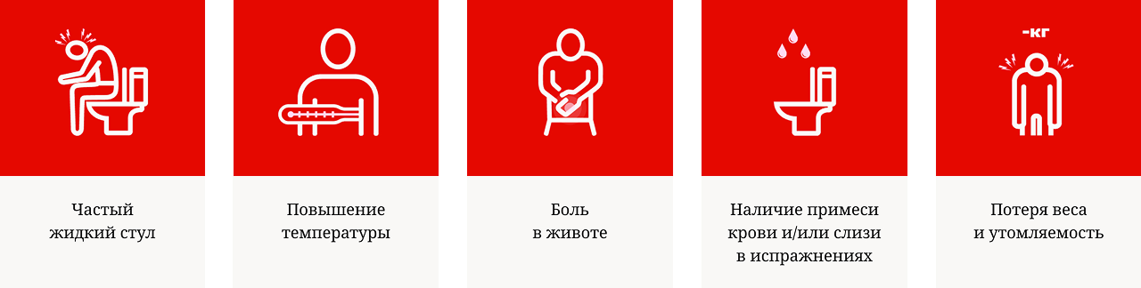 Болезнь Крона часто проявляется незаметно – в начале заболевания или при легком протекании болезни симптомы могут не нарушать качество жизни пациента, так пациенты часто отмечают послабление стула на протяжении длительного времени или эпизоды «кишечного отравления», которые часто связывают с несвежими продуктами, «другой» водой. Но заболевание может иметь и острое начало, поэтому такие пациенты довольно часто попадают в стационар с подозрением на кишечную инфекцию или острый аппендицит.